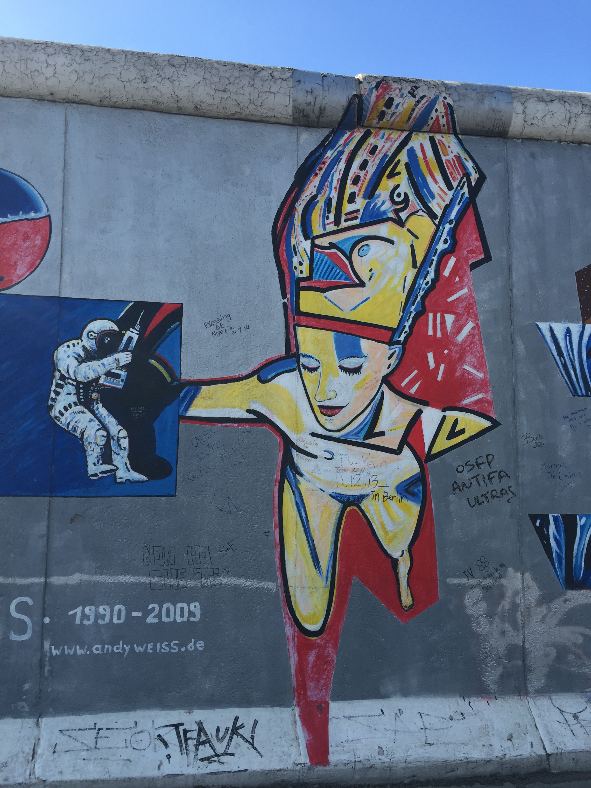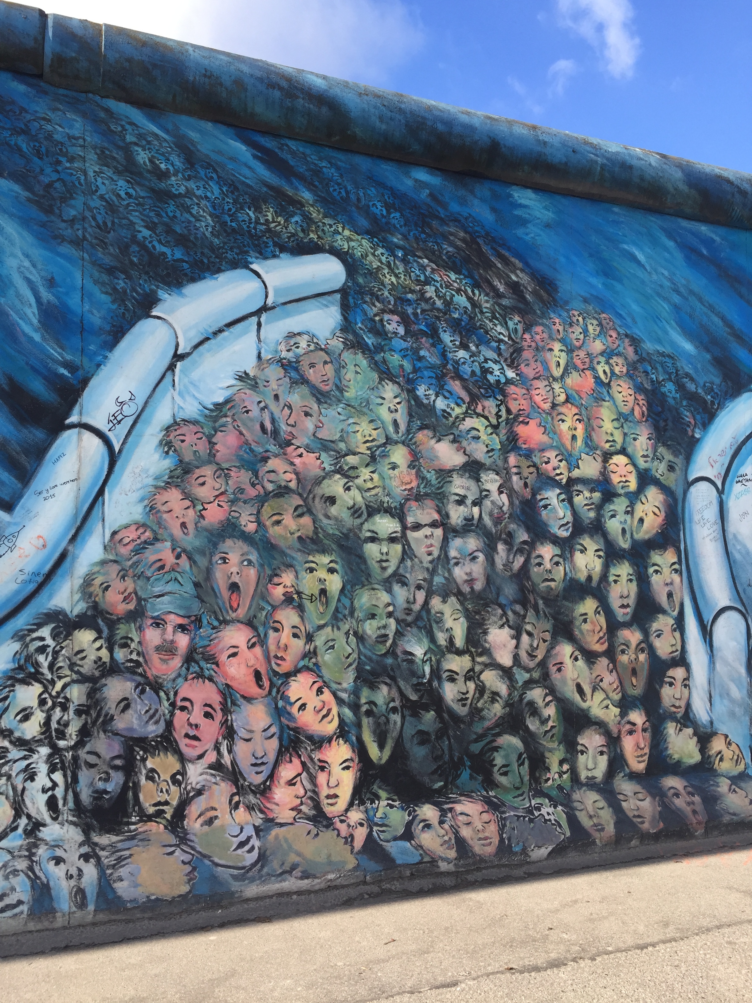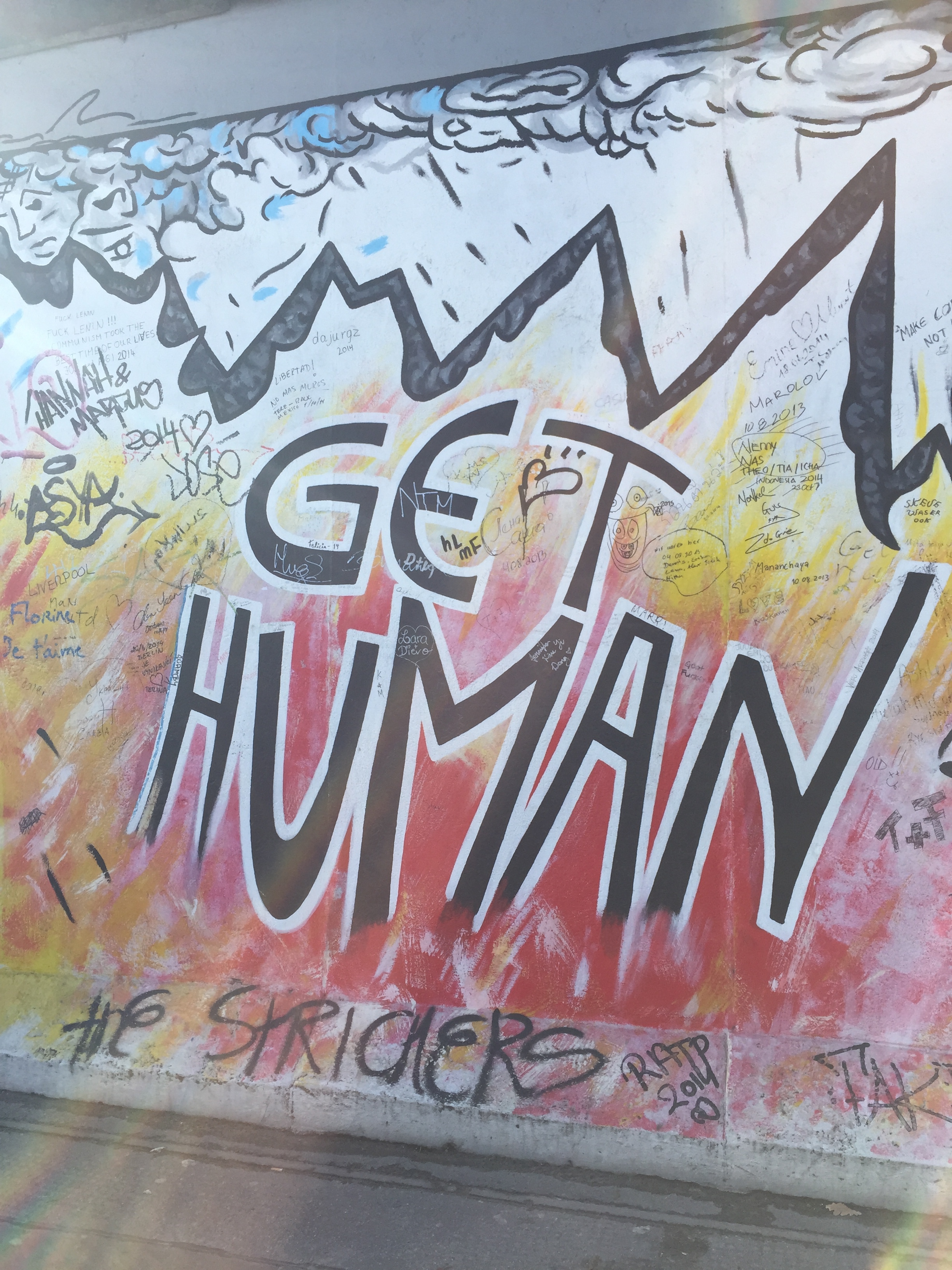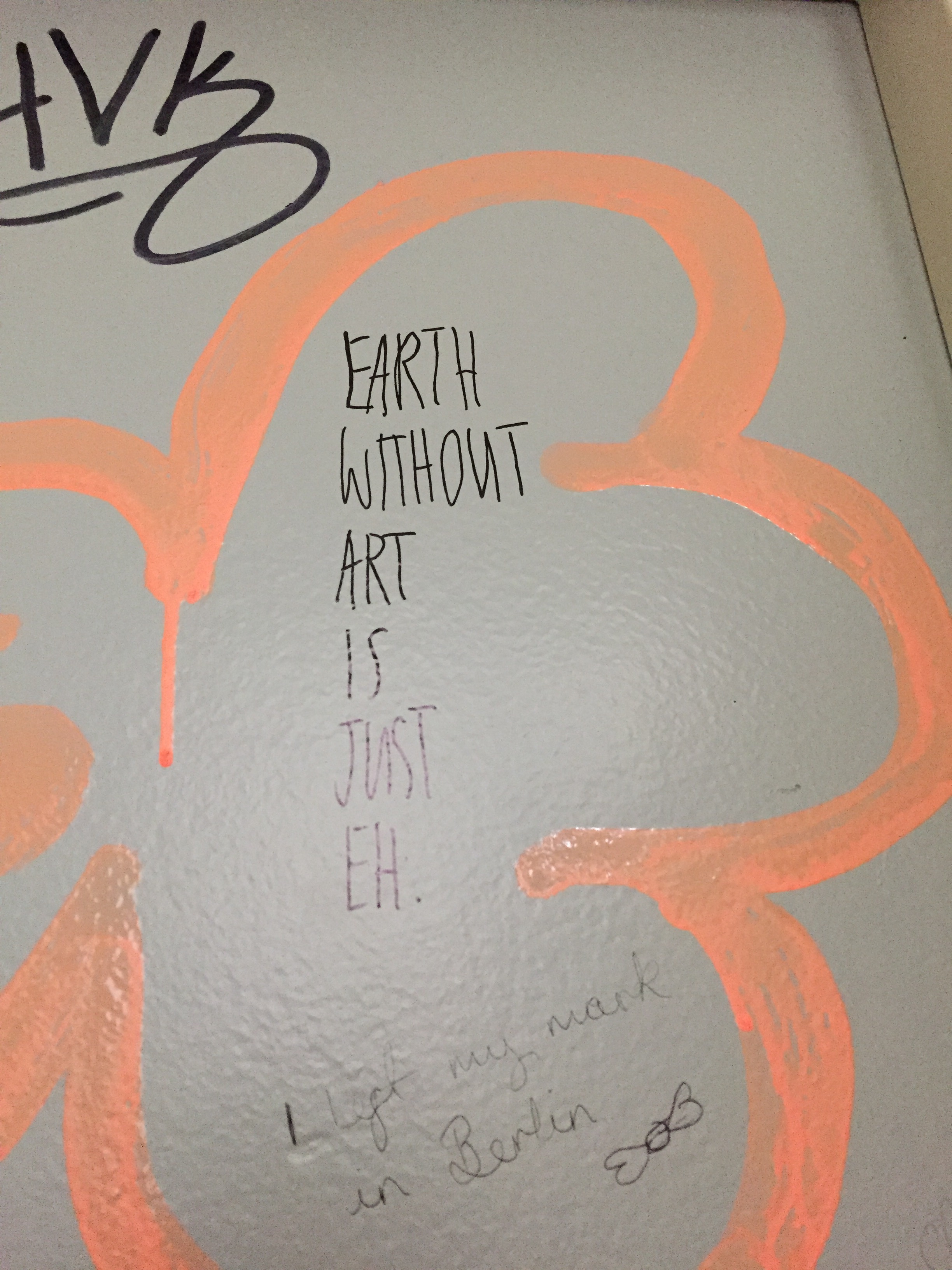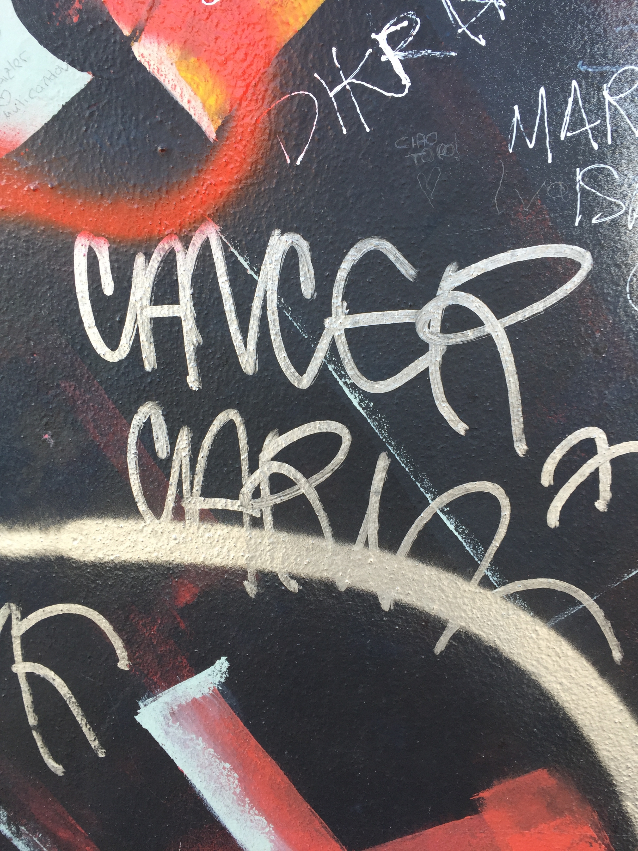 Strolling the East Side Gallery of the Berlin wall with a coffee in hand: I spotted a Cancer Carl tag, a street artist from Oakland, CA