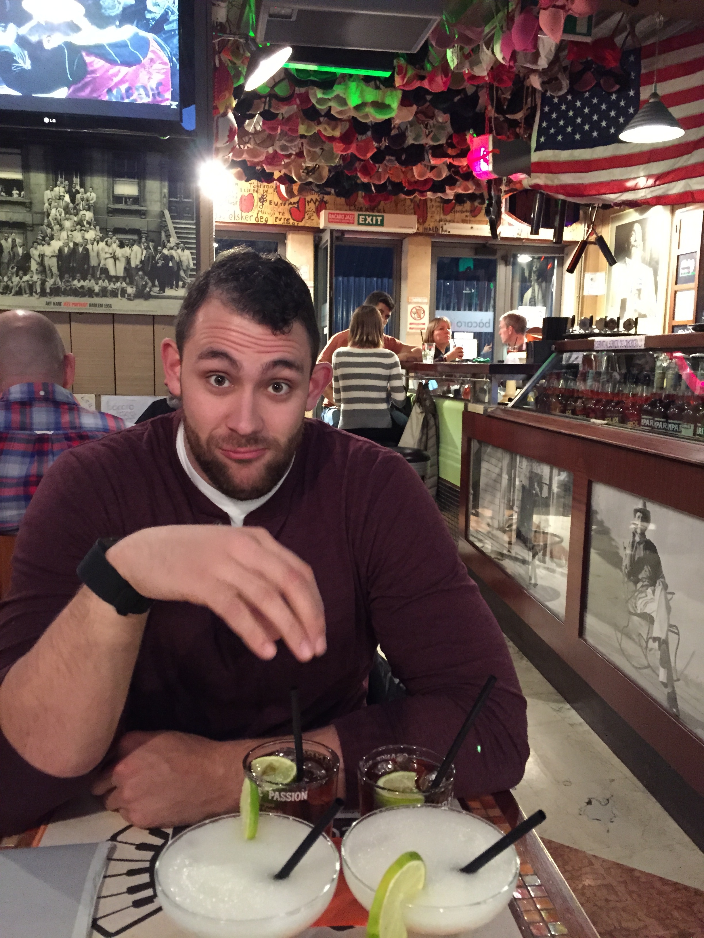 Bacaro Jazz Bar: there is zero nightlife in Venice but we found a 2 for 1 drinks at this total dive with bras handing from the ceiling and an old Rod Stewart concert being played on the television